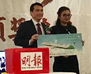 幸運獎長榮航空機票由Yun Qiu(右)獲得由長榮紐約分公司總主任張宇堂(左)頒發。