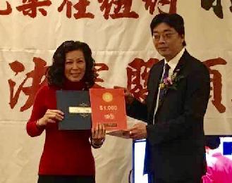 一等獎9號選手唐威獲得1千元現金,由贊助企業代表il Villaggio Consulting Inc.董事長狄鍾琪(右)頒發,由唐威的太太唐心美(左)代表領獎。