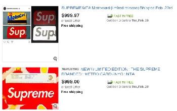 (明報23日訊)近日,由紐約大都會捷運署(MTA)與服裝品牌Supreme合作推出的限量地鐵卡在發售之後就遭到瘋狂搶購,截至昨日止,二手販賣網站上該地鐵卡標價已達1000元(圖)。