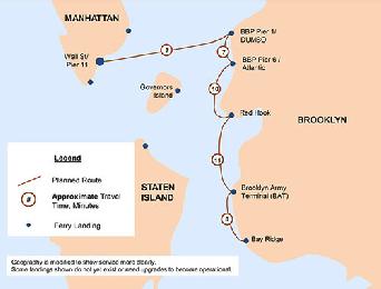 據介紹,由市長白思豪提出的全市5大行政區輪渡系統,總共耗資5500萬元。它停靠的港口包括:布碌崙日落公園灣脊區、海軍碼頭(Brooklyn Army Terminal)、紅鉤區(Red Hook)、布碌崙大橋公園(Brooklyn Bridge park)、曼哈頓1號碼頭(Pier#1)、6號碼頭(Pier#6)和華爾街附近的11號碼頭(Pier#11)。