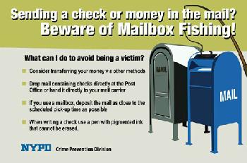 109分局局長哈里森前在警民會議上也指出,紐約市也發生歹徒用強力膠將公共郵箱內的信件如「釣魚」一般被釣出,並將信件內的支票改寫,到受害人的帳戶內取錢,哈里森表示,民眾可使用一種特殊墨水書寫支票金額,這種特殊墨水可以讓文件無法改寫。同時,民眾投遞郵件盡量到郵局直接投遞或者直接將郵件交給郵差。若是投到一般公共郵箱,盡可能選擇在接近收件時間之前投遞較為保險。