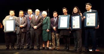 圖為斯靜格(左四)向柳寶枝(左一)、牛毓琳、韓裔法拉盛女青年會執行主任Katherine H. Kim及韓裔律師JD Kim(右三至右一)等4位亞裔人士頒發表揚狀。