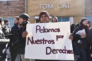 該家作坊早在奧巴馬執政時期就被國安部審計,審計要求僱主通知工人提供工作許可證明,否則將被解僱及面臨遞解。圖為早前該店工人在曼哈頓舉行抗議活動。