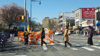 位於法拉盛緬街聖佐治教堂前的公車Q44及Q20A/Q20B站牌及街邊部份車道已被工程單位圍起,不准行人走近。MTA也派出工作人員站在車站牌旁告知民眾車站轉移之處,希望民眾及早適應新的交通狀況。