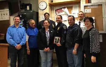 (明報20日訊)市警109分局昨晚在分局內舉行每月例行警民會議,109分局局長哈里森在會議上,向在4月份轄區內優秀表現的警員頒授「本月最佳警員」榮譽獎牌(圖,本報記者攝),並宣佈109分局日前獲市警總局批准,設立了109分局自己的臉書(Facebook)帳號,讓居民們可以透過推特(Twitter)或者臉書(Facebook)等現代社交媒體網站,與109分局執法人員進行雙向交流與溝通,民眾只需打進「NYPD 109th Precinct」就能查到該局網頁。