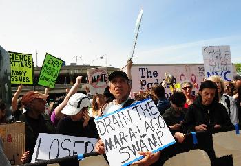 法新社與《紐約時報》報導,遊行團體成員高喊:「嘿、嘿,唐納川普得走人!」他們一邊抗議川普政策,一邊走上第12大道,前往一間由退役航空母艦改建而成的博物館,川普預定當日稍晚在此與澳洲總理用餐。