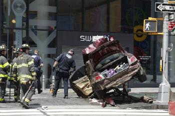 報導稱,一輛褐紫色本田昨日中午約12時沿時報廣場附近第7大道逆行,高速衝上人行道撞向遊客,造成1名女子死亡、22人受傷,其中4人傷勢危殆,3人傷勢嚴重。肇事司機為26歲的布朗士居民羅哈斯(Richard Rojas),當場被逮捕。羅哈斯在警局稱自己就是想要殺人,並想讓警察開槍擊斃自己。