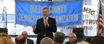 (明報23日訊)昨日上午,市長白思豪、市主計長斯靜格、市公益維護人詹樂霞、皇后區區長凱茲及皇后區所有現任市議員齊聚皇后區民主黨黨部辦公室,由黨主席國會議員克勞利主持、各黨代表投票,最後通過背書所有現任的民選官員與民意代表競選連任。