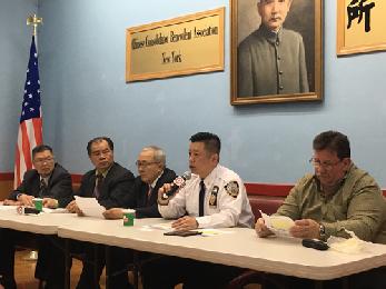 (明報8日訊)管轄區域包括曼哈頓華埠的市警5分局昨日下午在紐約中華公所召開警民會議。局長吳銘恆(右二)除提到華埠地區停車困難的問題有所改善外,還通報了打劫類犯罪數量大幅降低的喜訊。