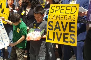 (明報12日訊)交通權益團體日前在市府前舉行集會,呼籲增設測速鏡頭和加重罰則。3年多前在法拉盛被車撞斃女童廖怡君的8歲兄長也到場,以行動支持正在推動的交通法案。