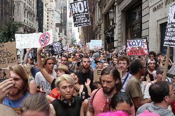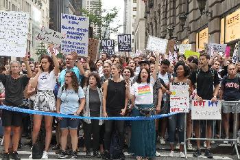 (明報16日訊)川普總統上任7個月以來於週二第一次回家,週二返回位於曼哈頓第五大道的川普大廈,卻遭遇數千名民眾大廈外抗議,而附近另一群人遊行時則模擬為總統舉行葬禮。川普的專機於當日晚上8點30分降落在甘迺迪機場,然後他直接登上一架直升機前往曼哈頓下城區,最後由一輛汽車把他送到了第五大道。