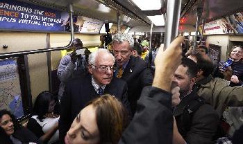 (明報31日訊)週一,聯邦參議員桑德斯與市長白思豪共同在紐約搭乘了地鐵(圖)。在等待了10分鐘後,二人坐上了市中心方向的A線列車。