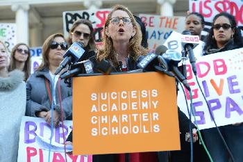 (明報30日訊)週三,在市政府門前,特許學校成功學院(Success Academy)首席執行官莫斯科維茨(Eva Moskowitz,圖一)公開指責紐約市市長白思豪(圖二)在校園建設工作上的失職,指其為未能建設並提供所需的足夠的教學場所。