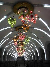 從入口處往下看,是一個不見底的坑洞,從地面到站,須時3分鐘。我們從建國站進去,乘一站至光榮站。與地鐵入口處那種樸實形象予人的感覺,地鐵站里巨大的壁畫、歐式的吊燈和挑高的拱頂,卻盡顯氣派。