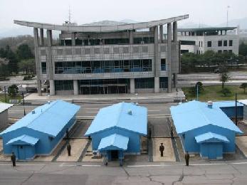 三八綫,藍色小屋中間界線之後,即是韓國領土。(圖:馬來西亞星洲日報)